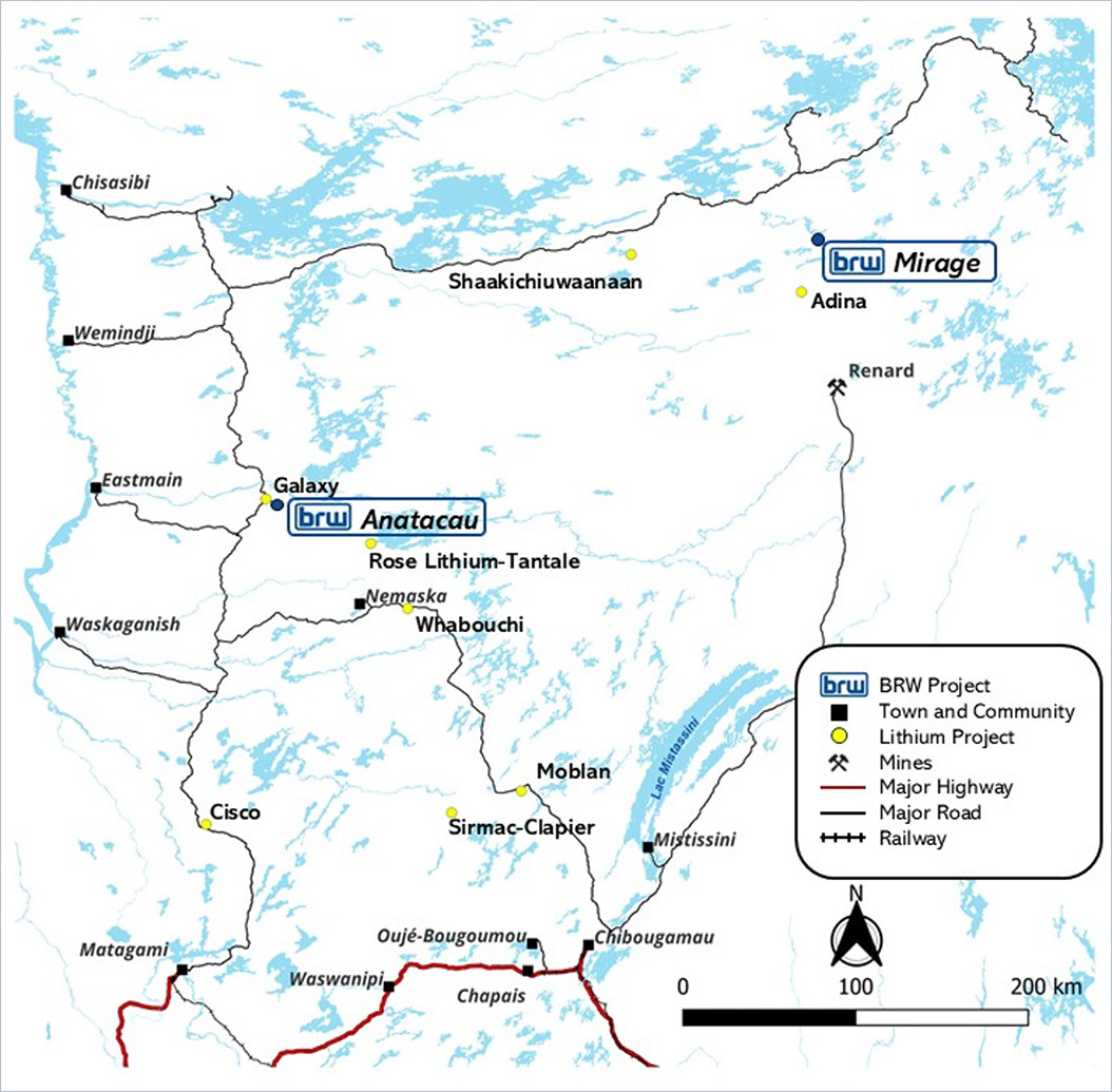 À l’automne 2022, BRW a conclu une entente d’option avec Osisko Development Corp. (TSX-V : ODEV) afin d’acquérir une participation de 90 % dans la propriété Anatacau, sécurisant ainsi une position foncière stratégique au sein d’un district du lithium émergent.