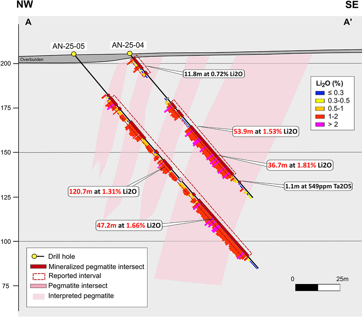 Brunswick Exploration a complété un premier programme de forage au diamant à l’indice Anaïs à l’automne 2025. Ce programme comprenait six trous de forage totalisant 795 mètres, tous ayant recoupé une minéralisation significative en lithium, ce qui met en évidence la solidité et la continuité du système à un stade précoce.