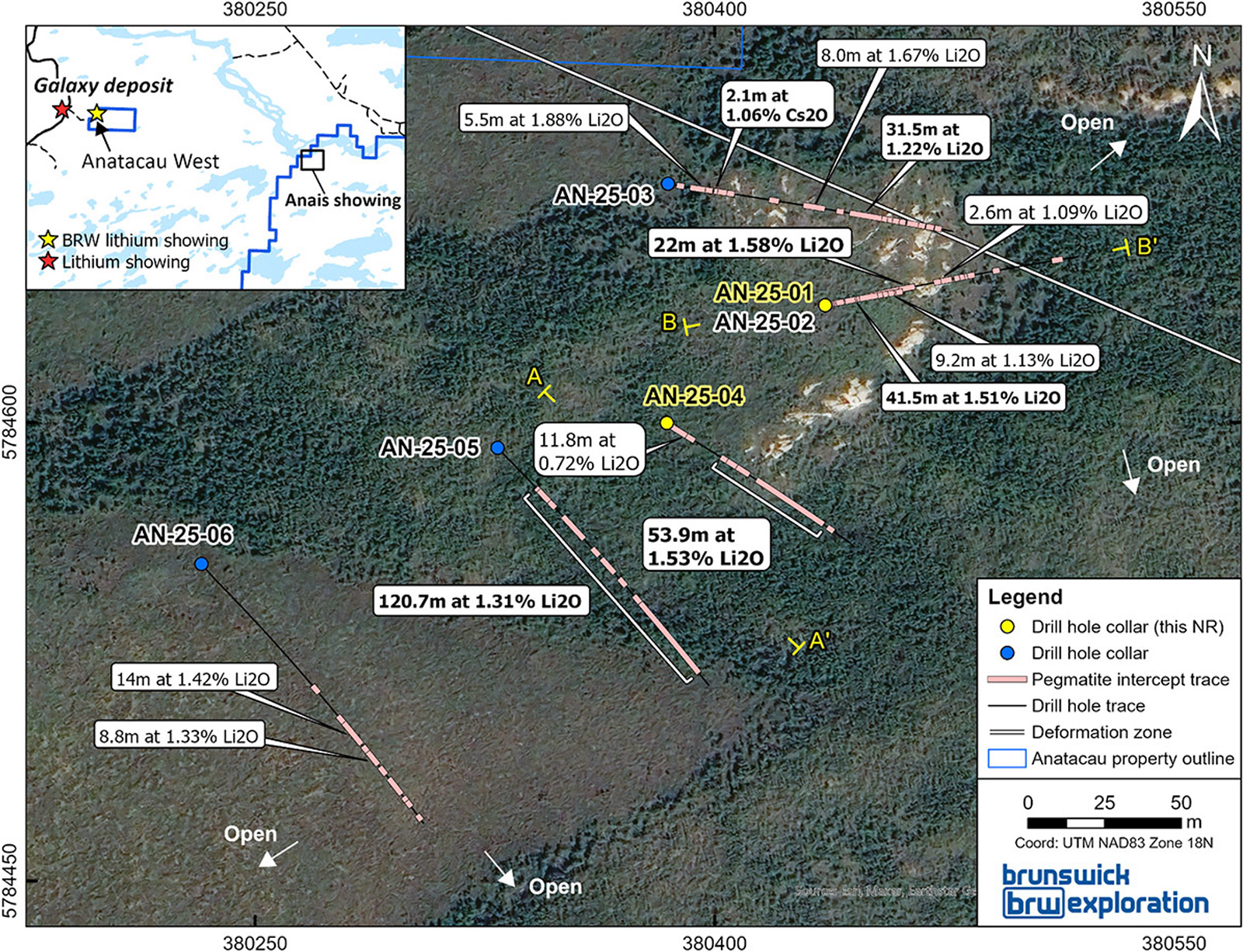 Le programme de forage inaugural a également confirmé un épaississement significatif des pegmatites à spodumène en profondeur et suggère la présence de multiples dykes de pegmatite empilés, plongeant de façon modérée à forte vers l’ouest-nord-ouest. Ce style de minéralisation est très similaire à celui observé au projet lithium de la Baie-James de Rio Tinto ainsi qu’au projet Anatacau Ouest de BRW, renforçant la continuité géologique et le potentiel à l’échelle du district du projet Anatacau Principal.